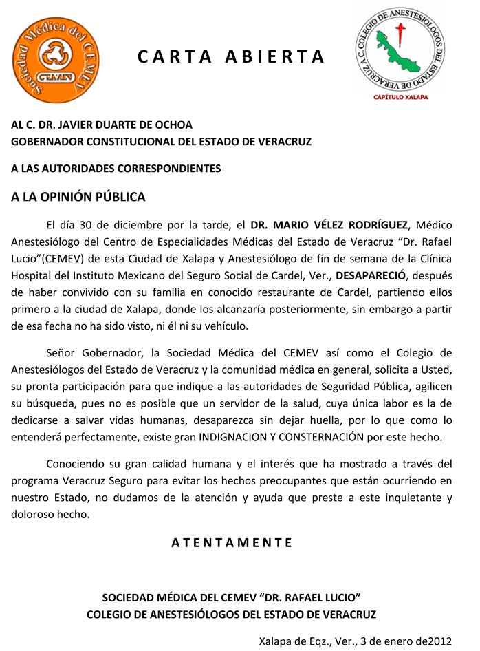 La comunidad médica en Xalapa lanzó un llamado al gobernador Javier Duarte de Ochoa y a las autoridades competentes para que agilicen las investigaciones y aparezca sano y salvo el especialista anestesiólogo Mario Vélez Rodríguez, quien presta sus servicios para el Centro de Especialidades Médicas “Doctor Rafael Lucio” y la clínica del IMSS en Cardel.